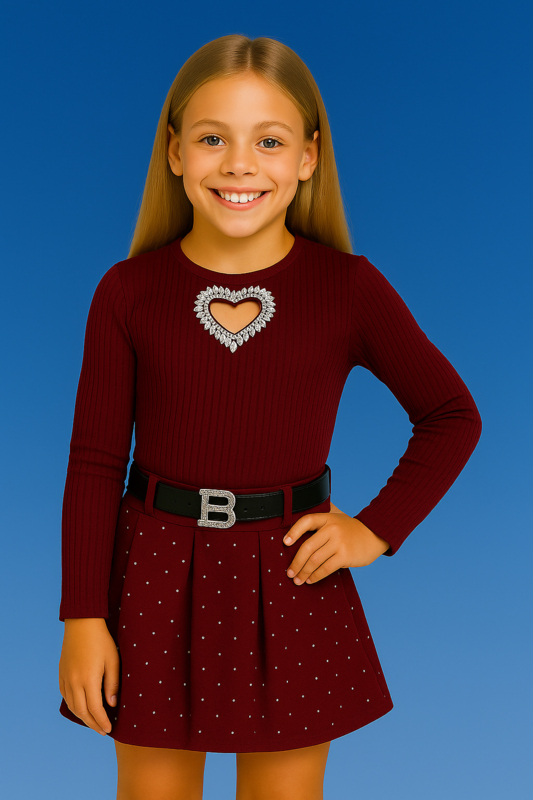 Trui met applicatie en rok met ceintuur en steentjes