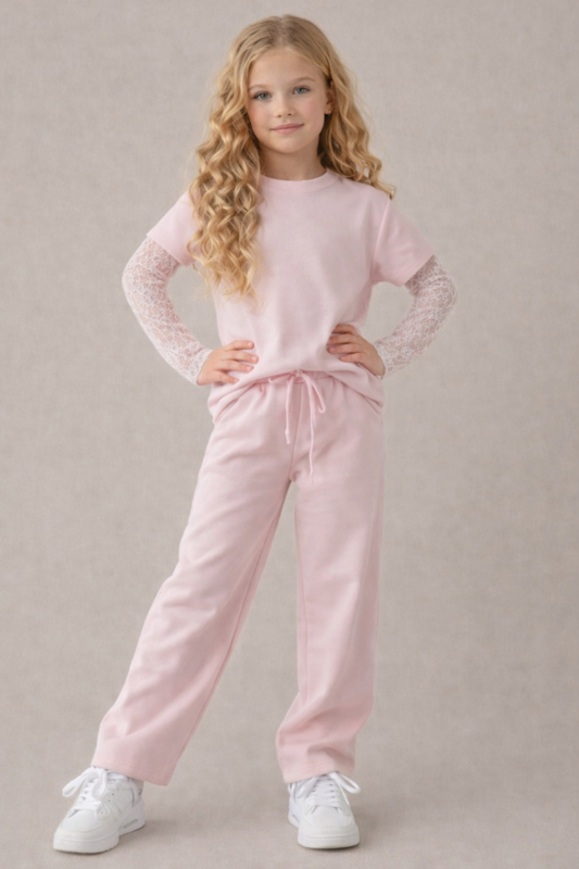 Comfortabele tweedelige set bestaande uit een soepelvallende top met kanten lange mouwen en een bijpassende broek met elastische taille en koord.