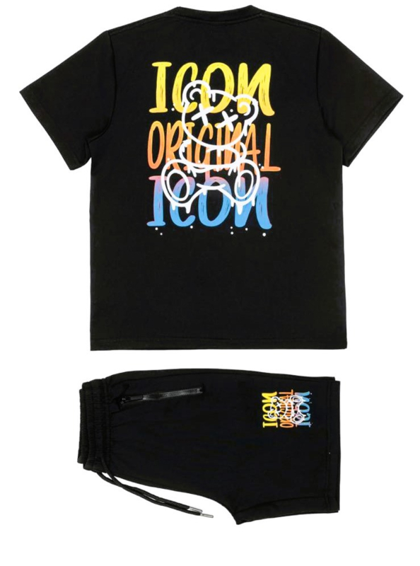 Stoere zwarte set met comfortabel T-shirt en bijpassende short. Het shirt heeft een subtiele, kleurrijke “Icon Original” print op de borst. De short is voorzien van een elastische tailleband met aantrekkoord en een sportieve ritszak.