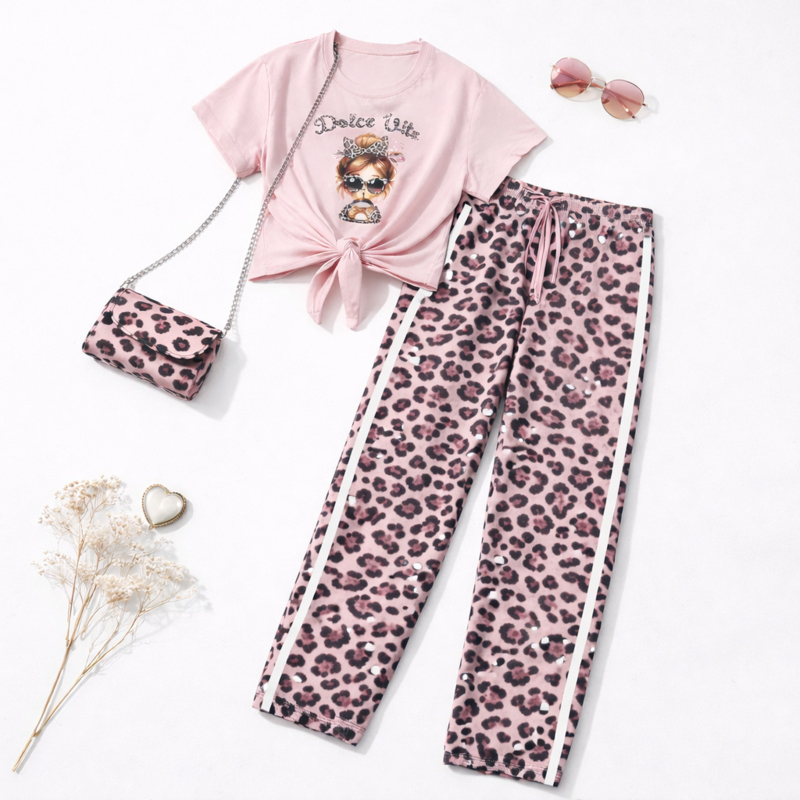 OverzichtTrendy tweedelige set met geknoopte top en lange leopard broek met witte zijstrepen,