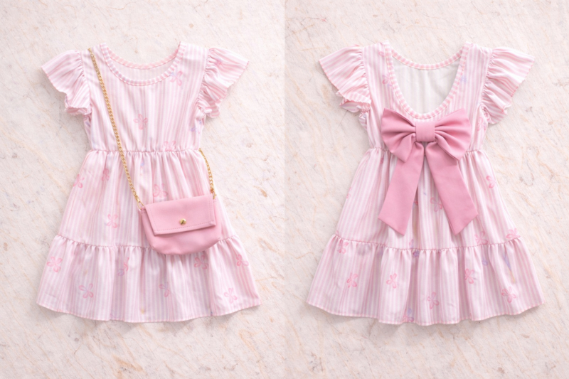 OverzichtJurk met fijne strepen, speelse ruchesmouwen en strik op de achterkant, inclusief bijpassend schoudertasje.