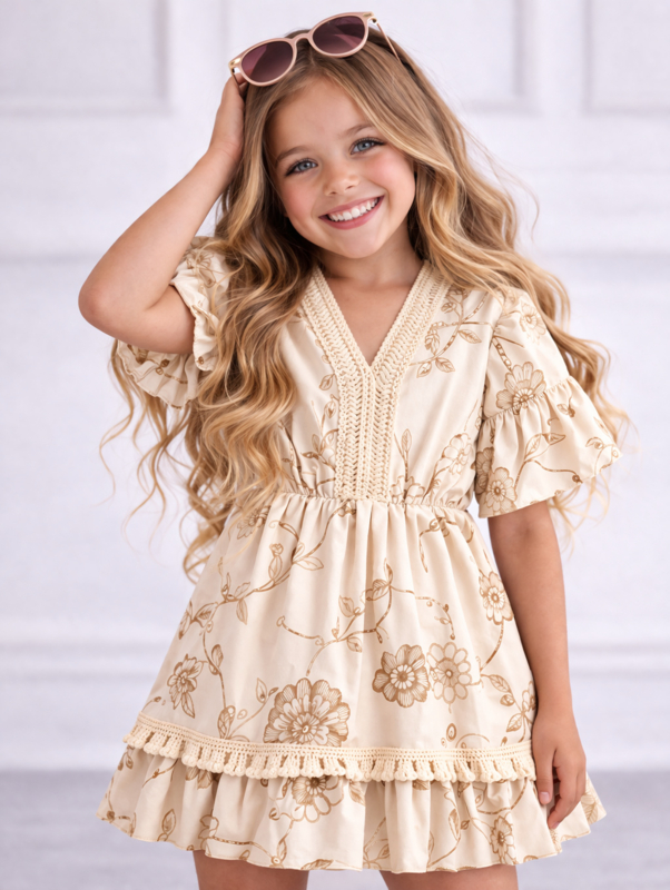 OverzichtLuchtige Ibiza jurk met sierlijke gouden bloemenprint, V-hals met kantdetails en speelse ruffle afwerking voor een zomerse, elegante look.