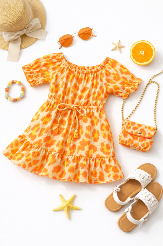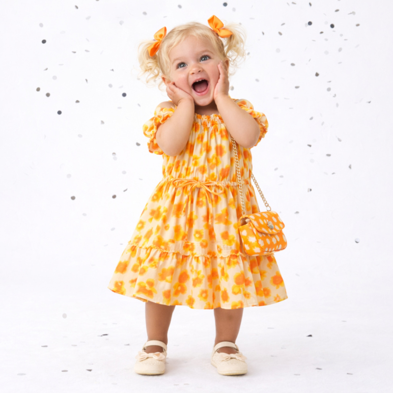 OverzichtEen vrolijk babyjurkje met speelse print, elastische halslijn en ruches, compleet met bijpassend tasje voor een zomerse en schattige look.