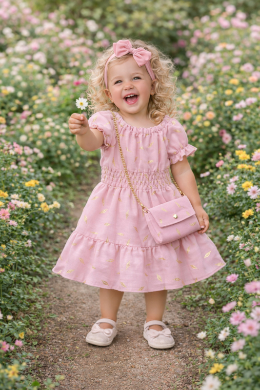 OverzichtLuchtige babyjurk met smockdetail, ruffle mouwen en subtiele goudkleurige bladprint voor een elegante en speelse uitstraling.