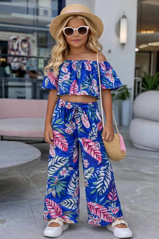 OverzichtZomerse 2-delige set met top en wijde broek in een opvallende tropische print, perfect voor een trendy en comfortabele look.