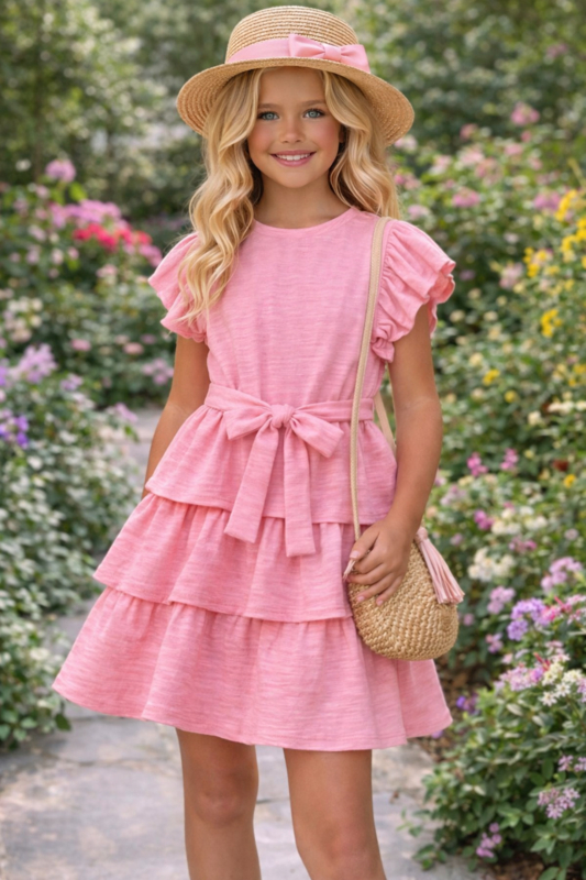 Luchtige, zomerse jurk met speelse ruches, een strikceintuur in de taille en een elegante, meisjesachtige uitstraling – perfect voor zonnige dagen.