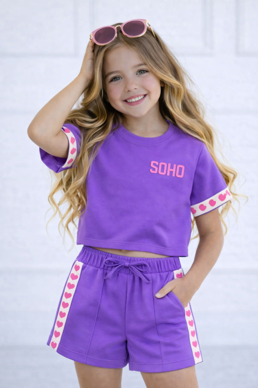 OverzichtZachte, trendy 2-delige set met T-shirt en comfortabele short, afgewerkt met speelse hartjesdetails langs de zijkanten en een subtiel “SOHO” logo voor een sportieve, zomerse look.