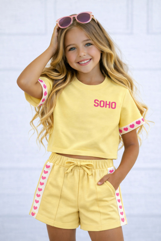 OverzichtZachte, trendy 2-delige set met T-shirt en comfortabele short, afgewerkt met speelse hartjesdetails langs de zijkanten en een subtiel “SOHO” logo voor een sportieve, zomerse look.