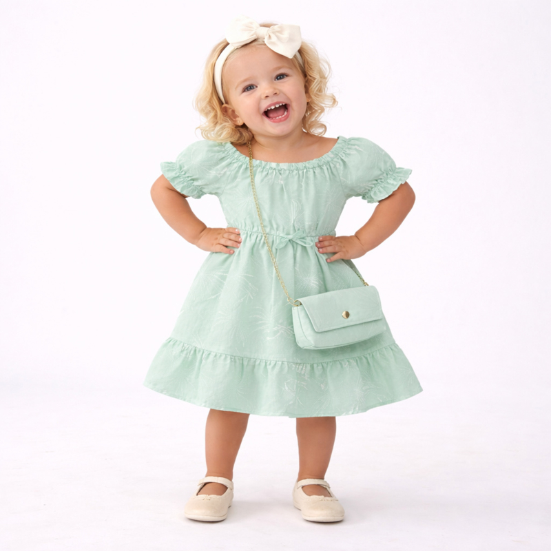 OverzichtLuchtige babyjurk met elastische halslijn, korte pofmouwtjes en subtiel ingeweven patroon, afgewerkt met een speelse volant en bijpassend tasje voor een complete zomerse look.