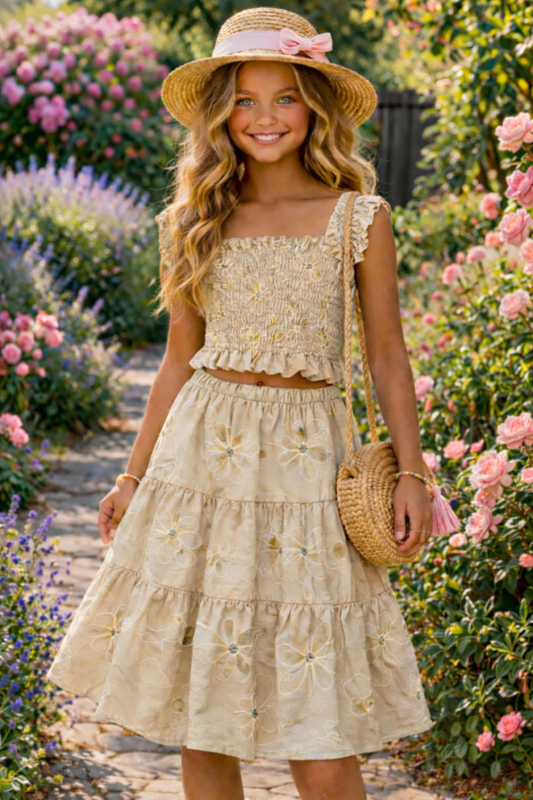 Een speelse tweedelige set met een gesmokte crop top en zwierige gelaagde rok, verfijnd met subtiele bloemendetails voor een frisse, zomerse uitstraling.