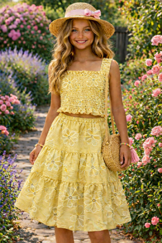 Een speelse tweedelige set met een gesmokte crop top en zwierige gelaagde rok, verfijnd met subtiele bloemendetails voor een frisse, zomerse uitstraling.