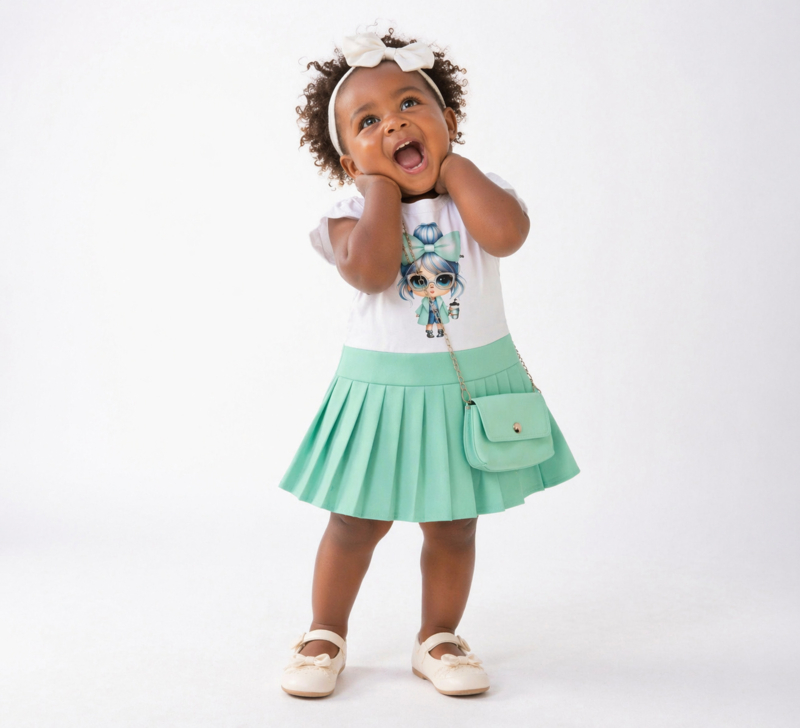 OverzichtSchattige babyjurk met wit T-shirt (print) en geplooid rokje, inclusief bijpassend schoudertasje met kettingband.