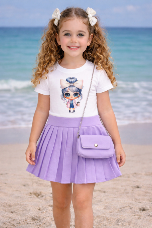 OverzichtLeuke meisjesjurk met wit T-shirt met print, geplooid rokje en bijpassend schoudertasje met kettingband.