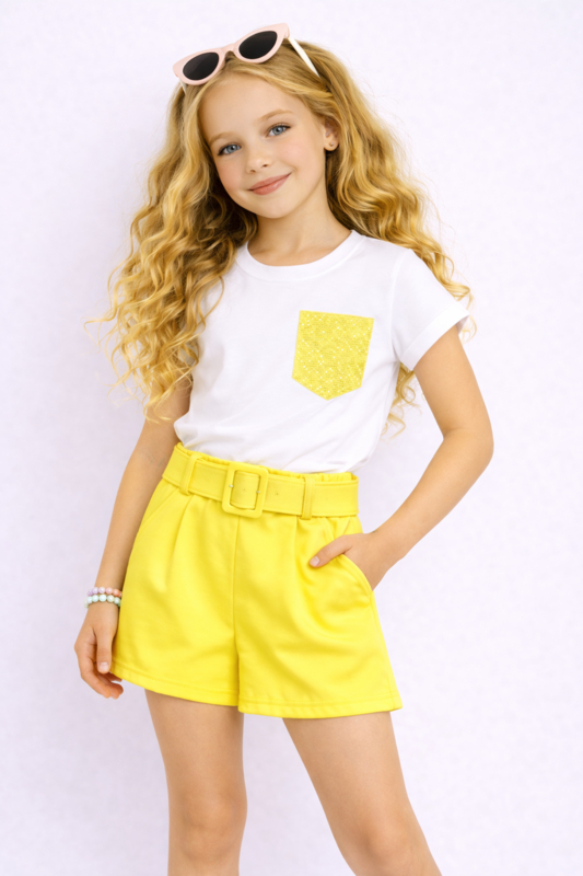 Zomerse set met wit T-shirt met glinsterende zak en high-waisted short met riem, speels en comfortabel. ( riem heeft kleine steentjes)