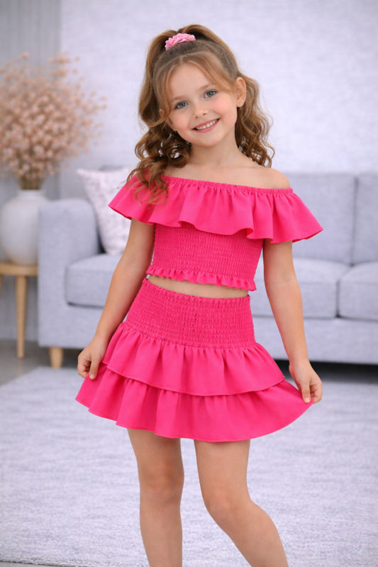 Speelse off-shoulder meisjes set met gesmokte top en zwierige rokje met dubbele ruches, perfect voor een zomerse look.