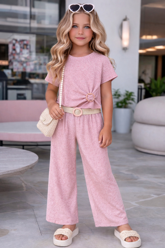 Een luchtige, zomerse set van een korte top met zijdetail en bijpassende wijde broek met gevlochten riem in een zachte pastelkleur.