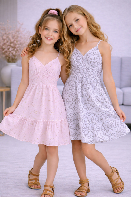 Een luchtige zomerse jurk met spaghettibandjes, een aangesloten gesmokte taille en een speels uitlopende rok in een zachte pastelprint.