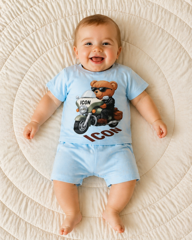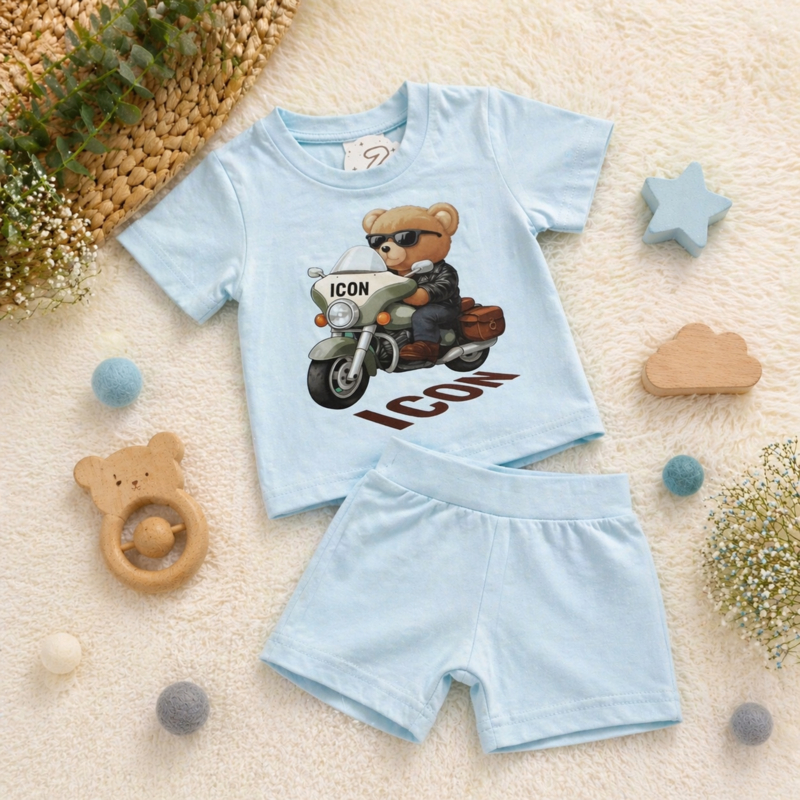 Babyset met T-shirt voorzien van een stoere beer op motor en bijpassend shortje, zacht, comfortabel en perfect voor een speelse look.