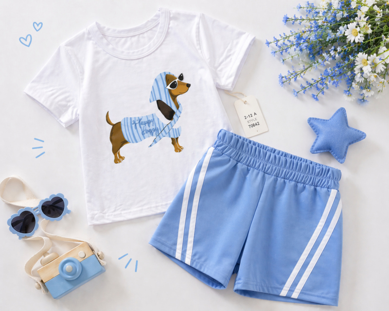 OverzichtEen sportieve en vrolijke set met een wit T-shirt met een speelse hondprint , gecombineerd met een comfortabel shortje met elastische taille en contrasterende witte zijstrepen.
