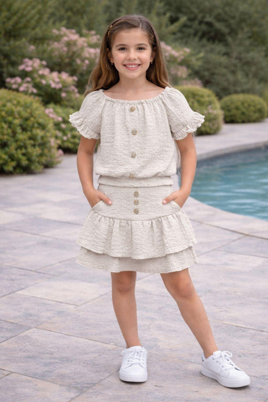 Een zomerse, speelse set met een off-shoulder top met knoopdetails en strik, gecombineerd met een bijpassend rokje met laagjes