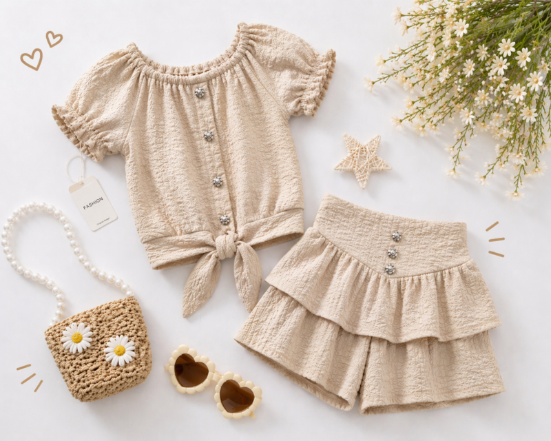 OverzichtEen zomerse, speelse set met een off-shoulder top met knoopdetails en strik, gecombineerd met een bijpassend rokje met laagjes