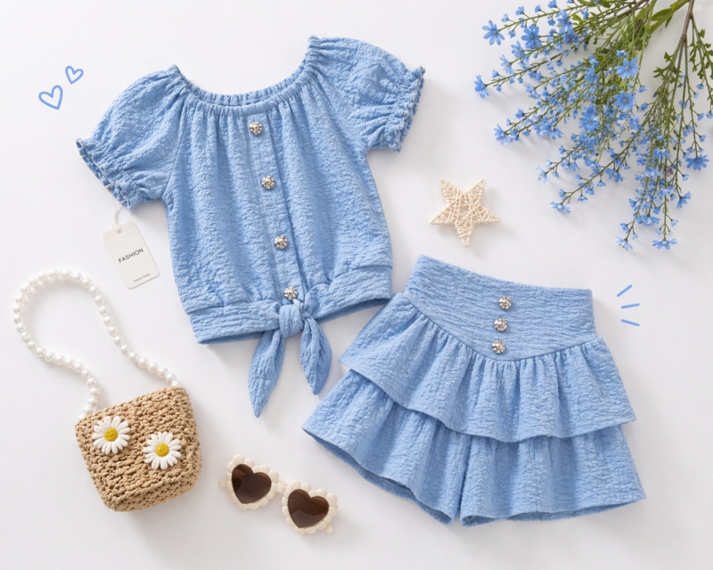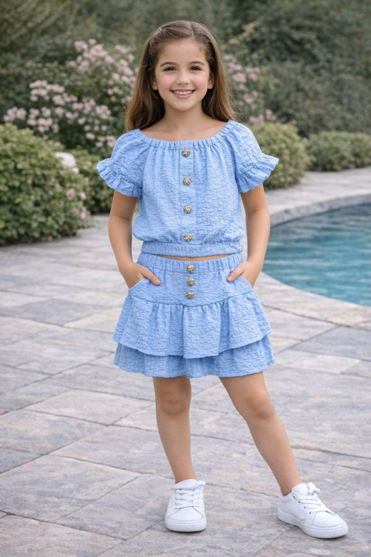 OverzichtEen zomerse, speelse set met een off-shoulder top met knoopdetails en strik, gecombineerd met een bijpassend rokje met laagjes