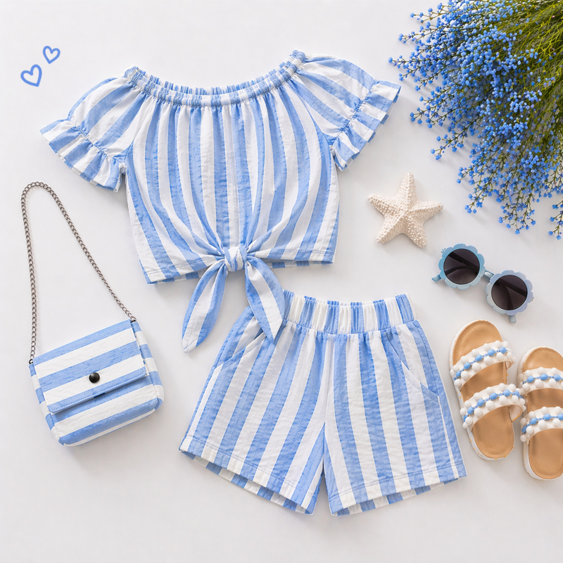 OverzichtEen luchtige zomerset met een off-shoulder gestreepte blouse met strikdetail en een bijpassend shortje, gecombineerd met een klein crossbody tasje in dezelfde print.