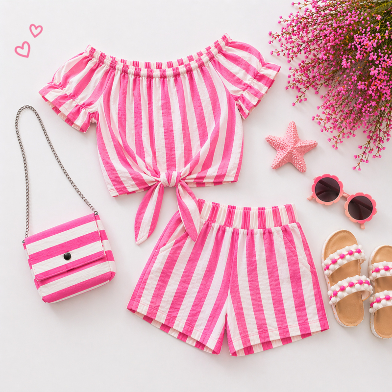 OverzichtEen luchtige zomerset met een off-shoulder gestreepte blouse met strikdetail en een bijpassend shortje, gecombineerd met een klein crossbody tasje in dezelfde print.
