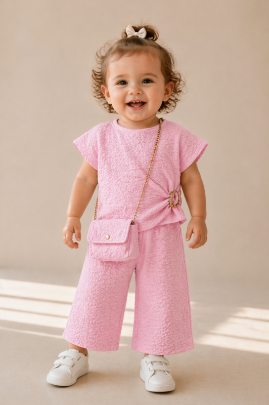 OverzichtEen zachte en comfortabele tweedelige set met top en wijde broek in een luchtige, licht gekreukte structuurstof met subtiele reliëftextuur en luxe uitstraling.