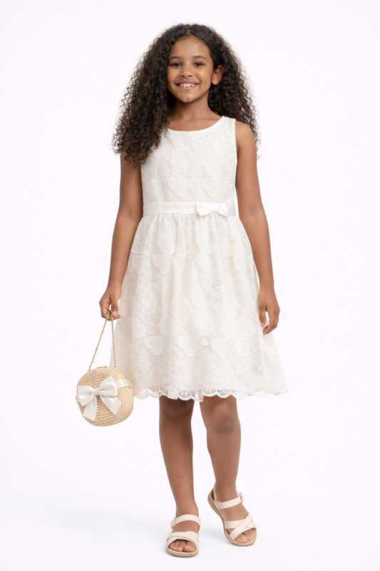 OverzichtKanten jurk met satijnen ceintuur (en afneembare bloemen applicatie)