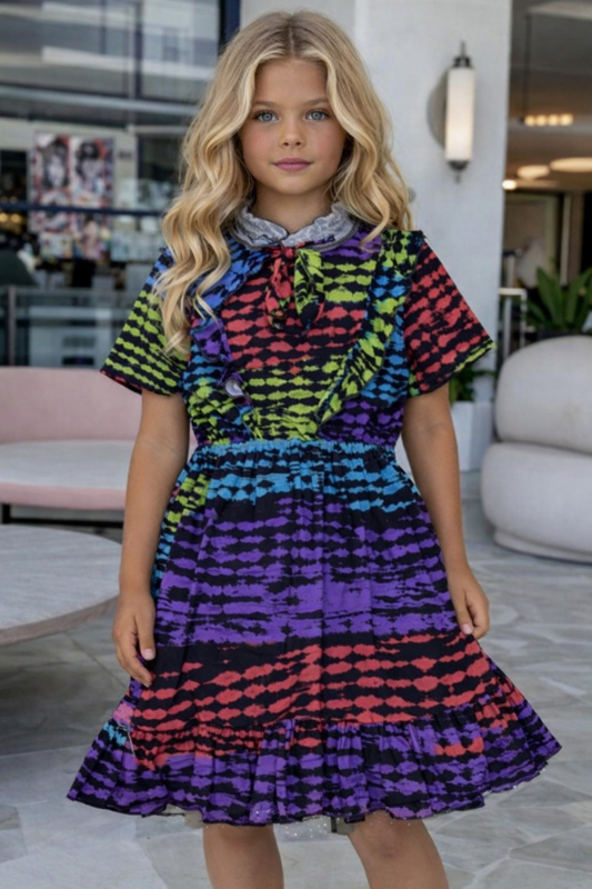OverzichtOpvallende jurk met kleurrijke tie-dye print in neon roze, paars, blauw en limegroen. Voorzien van een speelse ruche langs het voorpand, strikdetail bij de hals en een elastische taille voor een mooie pasvorm. De volant aan de onderzijde geeft de jurk een extra zwierige en trendy uitstraling.