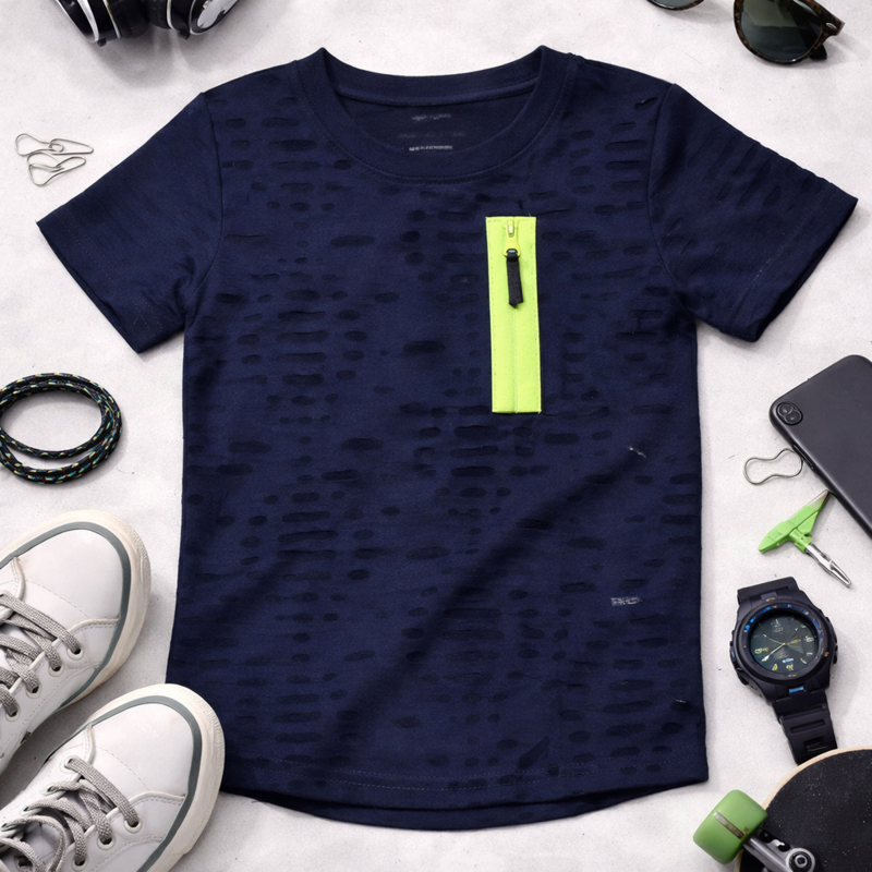 ZM5000 shirt marine (7pcs) nog enkele pakkettenTrendy shirt met open stukjes erin en neon groene rits