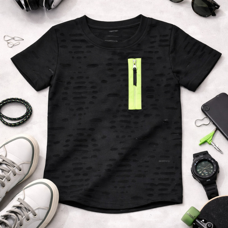 ZM5000 shirt zwart (7pcs)Trendy shirt met open stukjes erin en neon groene rits