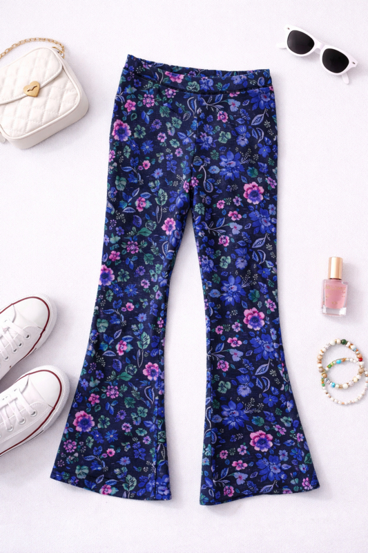 FRKU33631B BLAUW (6pcs)Velours flaredpants met bloemenprint