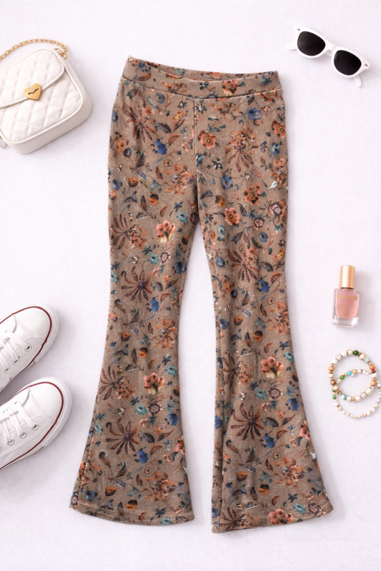 FRKU33631B CAMEL (6pcs)Velours flaredpants met bloemenprint