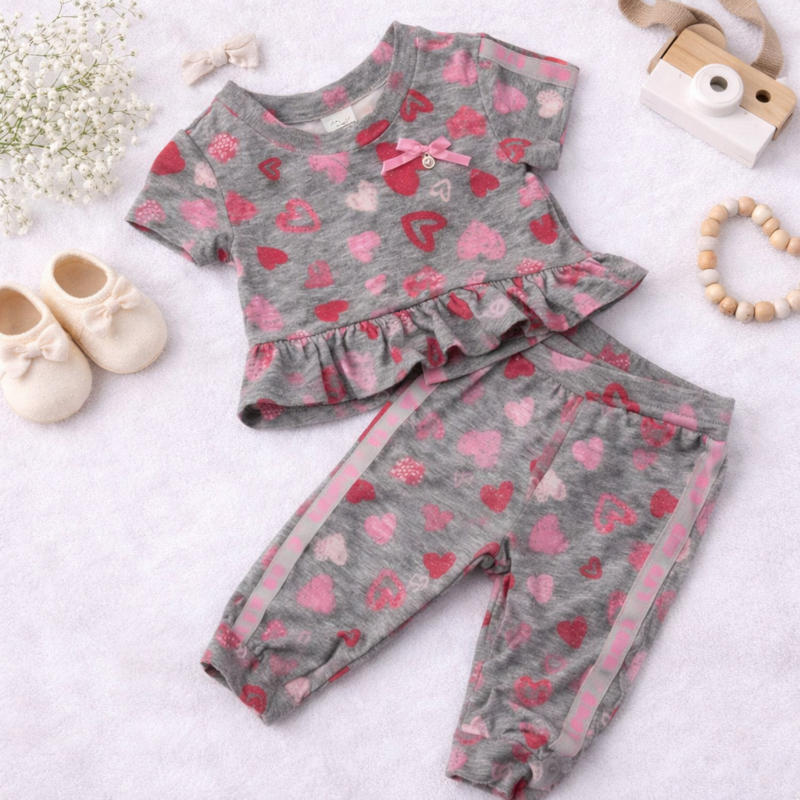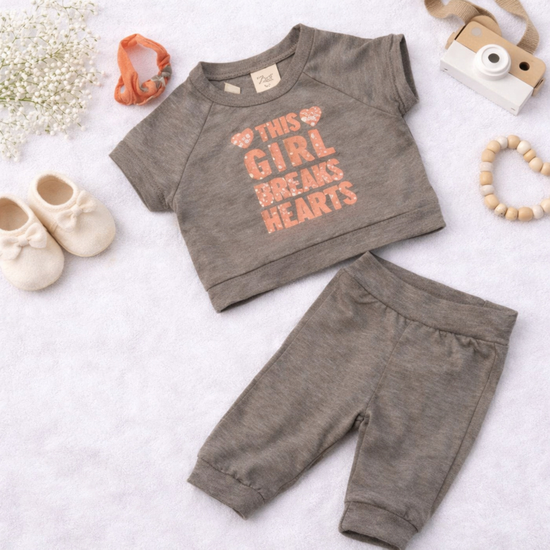 ZMB117-1 set grijs (8pcs)Zachte 2-delige babyset met glanzende “This Girl Breaks Hearts” print, bestaande uit een comfortabel cropped shirt en bijpassend broekje voor een speelse en stijlvolle look.